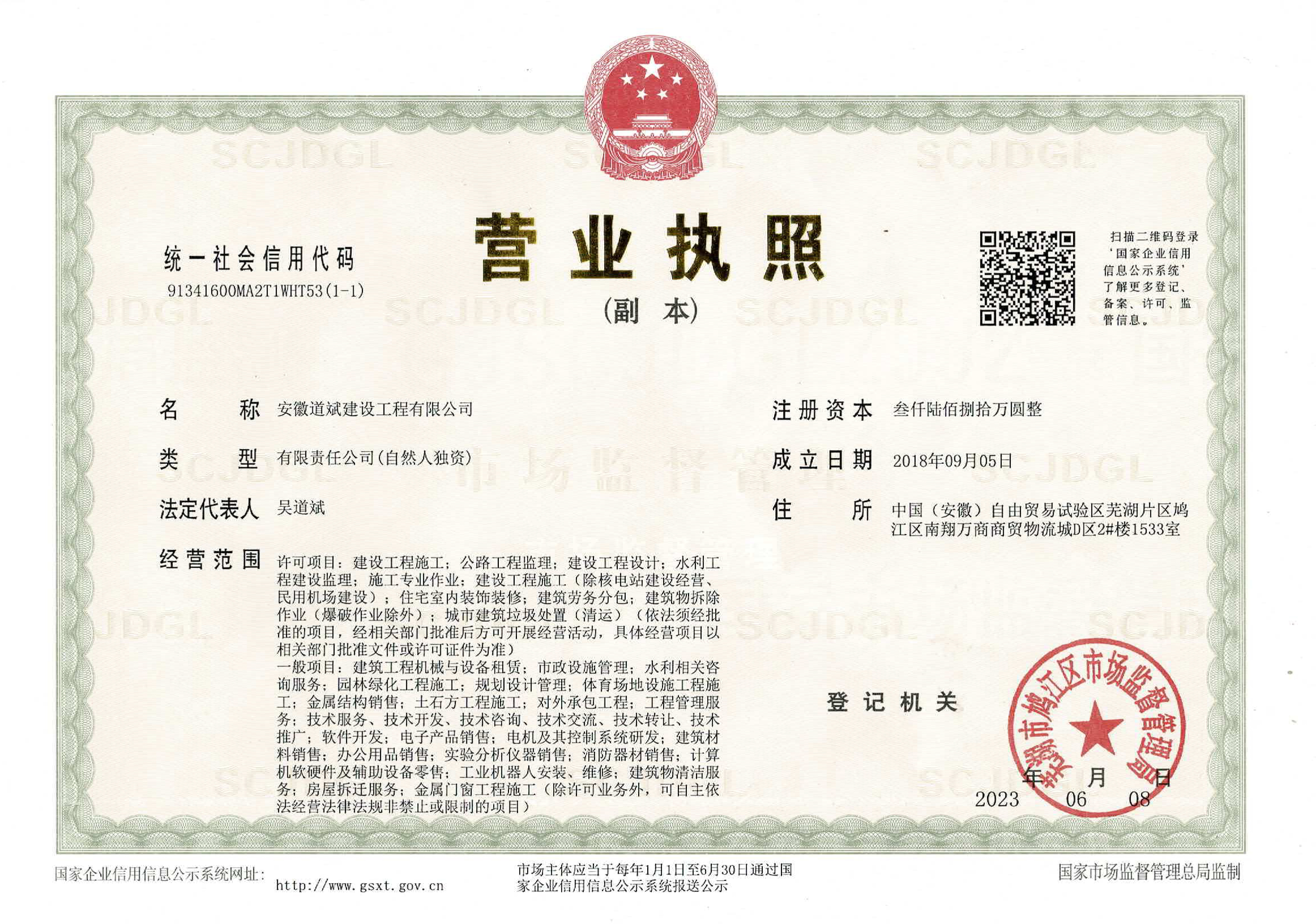 安徽道斌建設工程有限公司 版權所有 免責聲明 皖ICP備2021012659號-1 營業執照